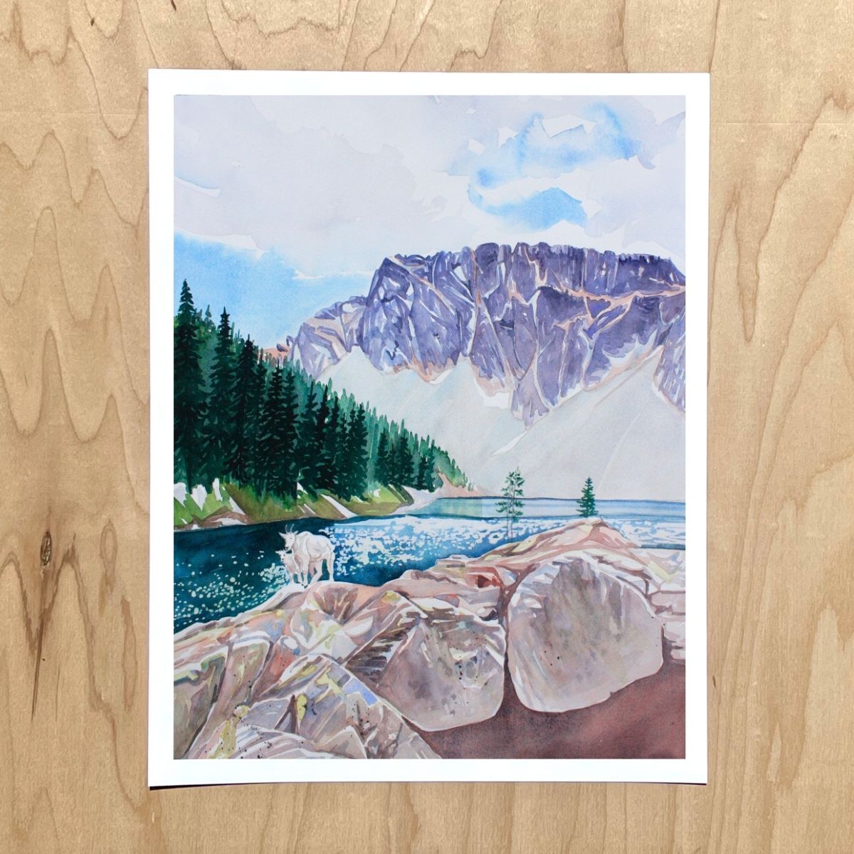 Blue Lake dazzles while a mountain goat and her baby stand watch on a nearby rock.